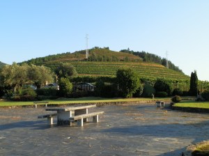 Ascendemos por el vial que serpentea entre sus viñas, jalonado por olivos y camelias, haciendo una parada en el espléndido mirador instalado encima de su bodega desde el que se contempla el valle de O Rosal, con el Miño al fondo que discurre majestuoso acercándose a su desembocadura entre A Guarda y Caminha.