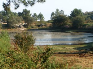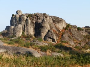 Tras unos cuantos balanceos en el enorme columpio que han instalado junto al monumento, continuamos nuestra marcha, ya metidos en plena sierra, por pistas forestales que suben y bajan por el monte casi siempre raso y seco excepto algunos tramos de pinar cuya sombra se agradece aunque el camino está casi cerrado de maleza y tojo lo que dificulta la marcha, a veces por pendientes pronunciadas que, ya bajo un sol un tanto opresivo, demandan un plus de energía a nuestras menguadas fuerzas.