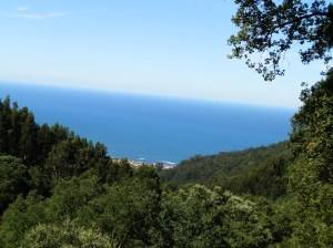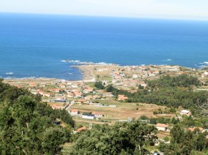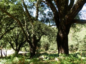 Dejando atrás las pozas seguimos durante unos 6 Km. por pistas forestales entre pinares y monte raso, a veces con espléndidas vistas de la costa de Oia, hasta adentrarnos en las Sobreiras do Faro, un espléndido bosque de alcornoques,  en las orillas del río Broi, completamente seco en estos días.