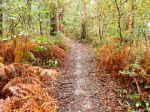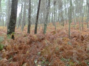 Pistas forestales adornadas con el intenso color castaño de los altos helechos que crecen en los pinares, caminos entre castaños y carballos que exhiben sus hermosos colores ocres y dorados propios de la estación, brillante el suelo por la hojarasca mojada, hacen de esta caminata un agradable paseo sin apenas cuestas hasta que llegamos al último tramo ya por por el río Tea que, después de tantos días de sequía, ha llenado su cauce por el que fluyen alegres sus verdes aguas.
