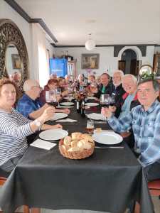 Croquetas de bacalao y ternera con guarnición, entre otros platos del menú del día, colman nuestras hambres mientras disfrutamos de la grata convivencia entre los caminantes de Los Lunes al Sol.