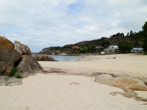 Pero para alcanzar el premio que ofrece ese precioso tramo de costa salpicado de  solitarias playas  de arena fina y blanca hay que pagar un precio y ese es un recorrido previo por 10 Km. de asfalto desde el barrio de Menduiña hasta la playa de Lagos.