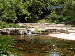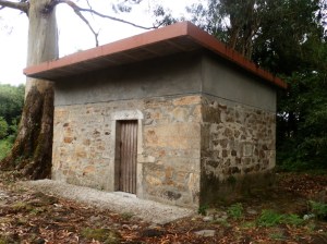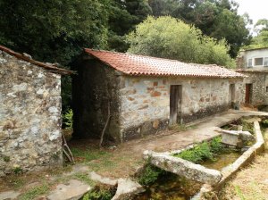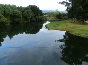 No lejos de las Aceñas, un parque al borde del Tamuxe con piscina natural y mobiliario propio de estos sitos, nos detenemos ante una parcela llena de los arbustos del preciado manjar un tanto decepcionados al comprobar que apenas se ven unos pocos que penden de sus ramas, cuando una lugareña que pasaba por allí nos advirtió: «Este ano non toca» y es que, por lo visto, unos años hay fruta y oros no. Este era del no, así que continuamos la caminata por los hermosos senderos que discurren paralelos al río plenos de verdor y bajo la sombre de la frondosa floresta ribereña, hasta que llegamos a las cercanías del Parque das Pías vadeando el río por una antigua pontella para dar con O Muiño do Rial, un adefesio construido sobre uno antiguo que fue derribado en en parte por la rama de un enorme eucalipto que se desprendió durante un temporal.