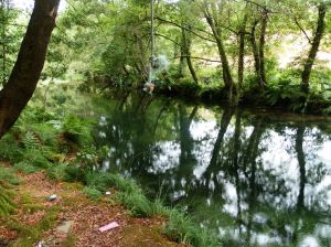 Nos desviamos del río para seguir por pistas forestales y algún que otro núcleo rural para vadear de nuevo el río a la altura de Fornelos y continuar por el sendero fluvial, que discurre por su orilla derecha siguiendo su curso de plácidas aguas, ora transparentes ora oscuras como un espejo en el que se refleja la densa vegetación que nos provee de sombra y frescura.