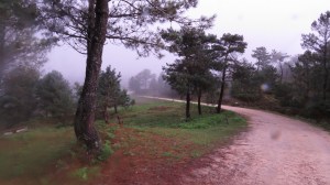 Sigue la ascensión a los Cotos de Sesteiro con bastante pendiente, rodeados ahora sí de lluvia de verdad. Lo que al principio de nuestra marcha era solamente agua en suspensión, cae ahora con más peso. Pero la temperatura es agradable y no nos incomoda el agua que se va depositando en nuestra ropa, nuestras manos, nuestras gafas…