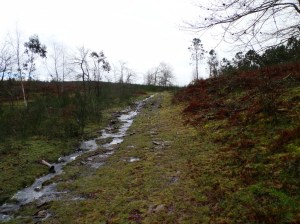 Iniciamos la ruta en la iglesia de San Miguel de Carballedo, entre las parcelas acotadas y cruzadas por las pistas de lo que fue un proyecto de Extensión Agraria que no sé si sigue en uso a estas alturas. Los caminos y campos están inundados por la lluvia y hasta el lugar conocido como A Braña das Pozas Secas está casi intransitable convertido en una piscina natural.