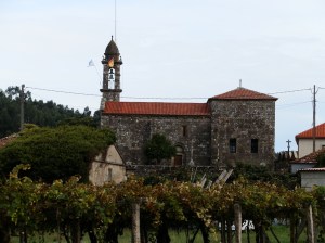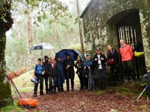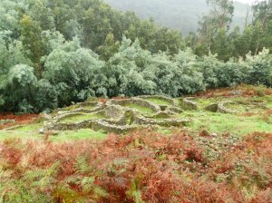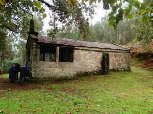 Seguimos por el monte hasta la capilla de Santa Tecla en donde nos detenemos para tomar el plátano reglamentario y desde allí, a un tiro de piedra, se encuentra el Castro de Troña, una citania con su poblado castrexo, una capilla del s. XVII dedicada al Dulce Nombre de Jesús, un precioso cruceiro y una caseta en la que, por lo visto, dormían los devotos en la noche anterior a la romería que aún se sigue celebrando en el mes de agosto.