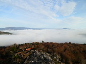 Para llegar hasta allí hemos partido del lugar de San Amaro, en Crespos, en continuo ascenso hasta la ermita de San Miguel y el Mirador de A Quinta, dos atalayas con vistas sobre el impresionante mar de niebla que las rodea.